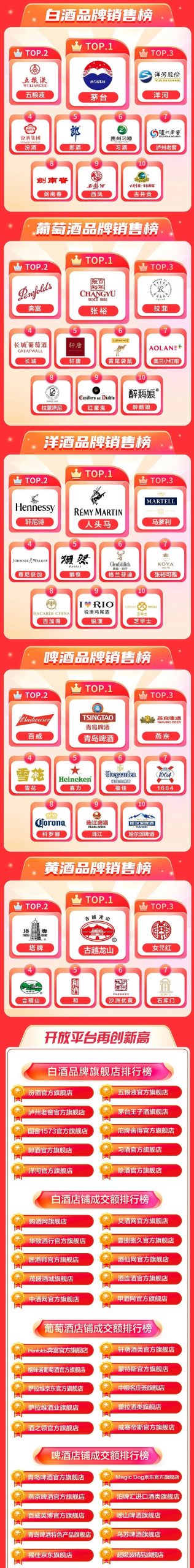 重点品牌销售爆发,其中茅台成交额同比增长2倍,奔富成交额同比增长7倍,口子窖、贺兰红成交额同比增长2倍,今世缘、人头马、张裕可雅、雪花、百威、洋河、舍得、布赫拉迪等品牌成交额同比增长均超100%。
