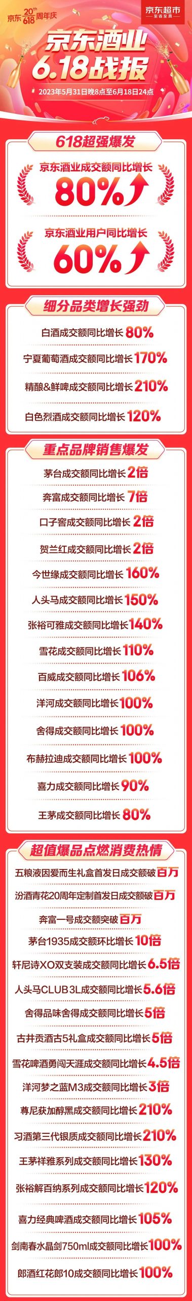 6月19日,京东酒业发布618全时期战报,自5月31日20点至6月18日24点,京东超市酒类超强爆发,实现成交额同比增长80%,用户同比增长60%。