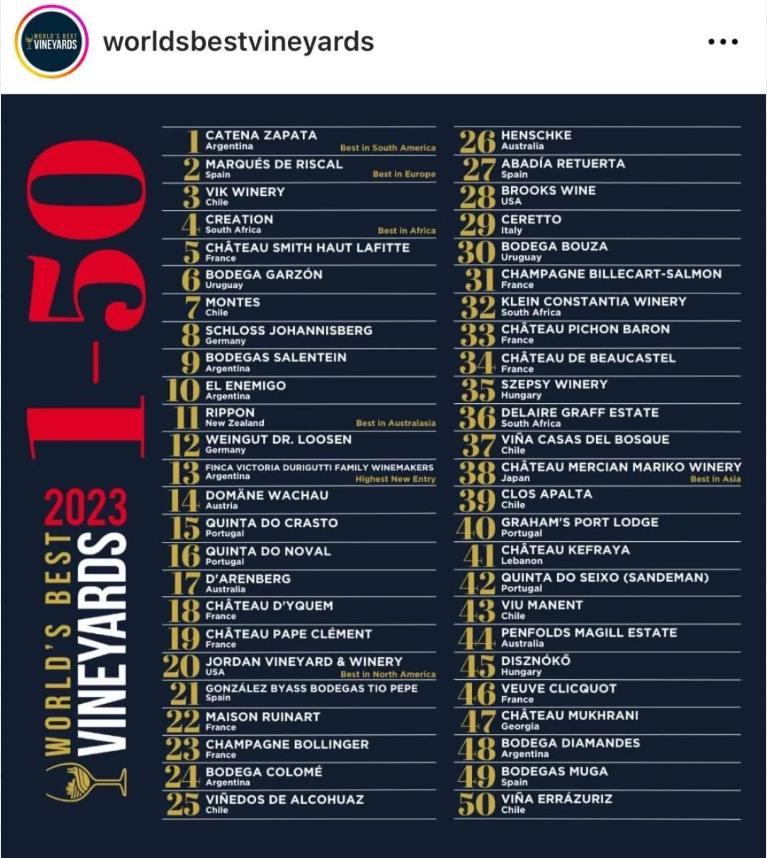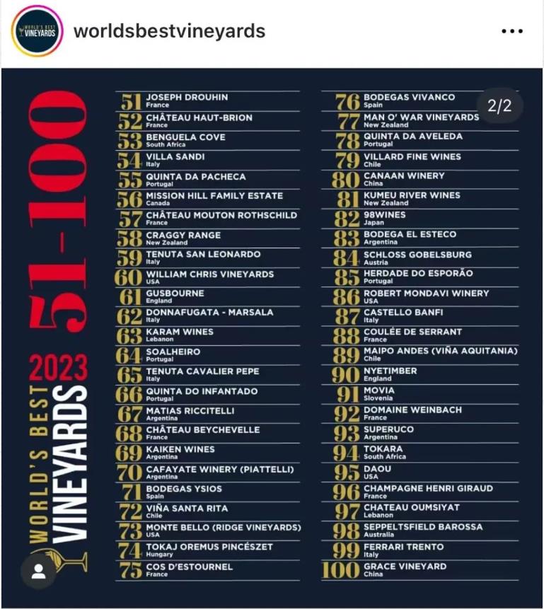 让我们来看看2023“世界最佳葡萄园”百大获奖名单: