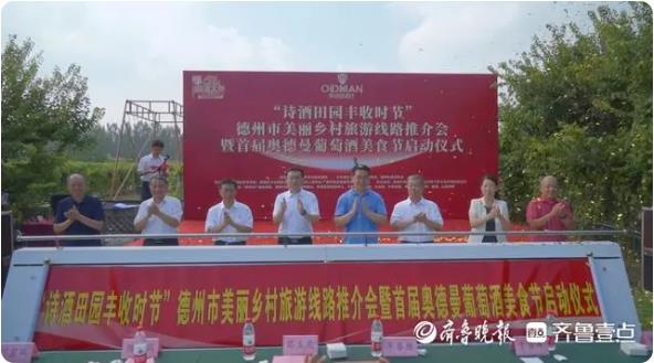 奥德曼酒庄董事长徐义介绍了酒庄发展成果,德城区区委常委、副区长刘桂芝致辞,山东省旅游协会副会长、市旅游协会会长、东海集团董事长魏建国宣读倡议书,德州市旅游协会推介了全市精品旅游线路。德州市旅游协会与12县市区分别签订了美丽乡村合作协议,德城区、庆云县作为县市区代表与市旅游协会签订美丽乡村旅游合作协议;庆云县委常委、宣传部长李臻代表各县市区发言并作了文旅康养产业推介。最后,与会领导们共同启动黄河大集—“诗酒田园丰收时节”德州市美丽乡村旅游线路推介会暨葡萄酒美食节。