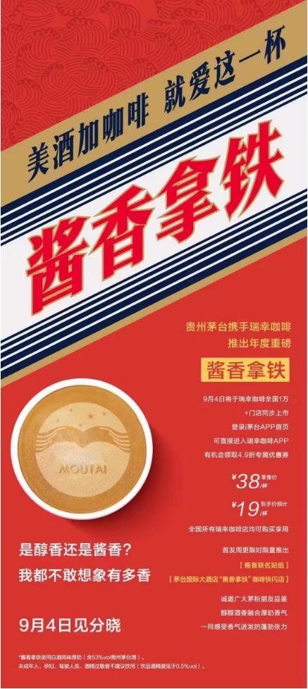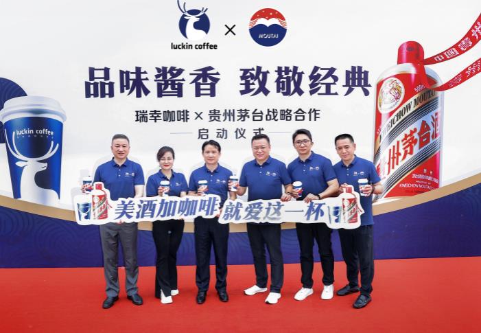 瑞幸咖啡×贵州茅台战略合作启动仪式上,双方联合推出了首款茅香咖啡——酱香拿铁,每一杯都含有53度贵州茅台酒,让消费者体验到美酒+咖啡的完美交融。据悉,该产品已于当日在瑞幸咖啡全国门店上线。