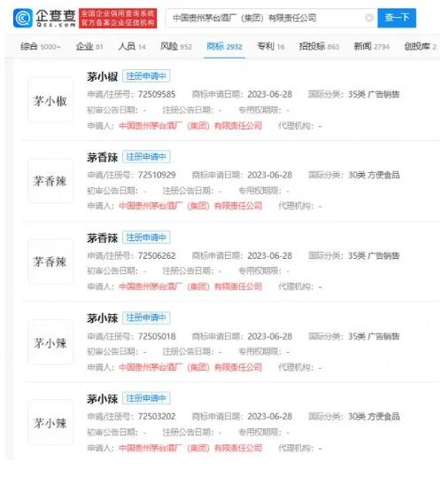 从市场渠道获悉,茅台申请注册了“茅小椒”“茅香辣”“茅小辣”商标,将推出“茅台辣椒酱”产品。据酒业评论人肖竹青对蓝鲸财经记者透露,此前在茅台品尝过一款贵州辣椒酱,是利用茅台发酵技术结合贵州特产辣椒酱工艺相结合研发的新项目,预测茅台辣椒酱在不远的将来也会实现产业化。