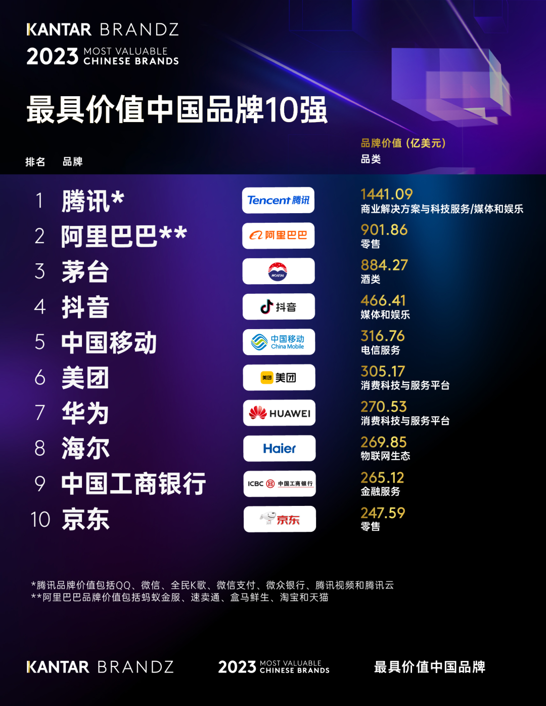 腾讯(1441.09亿美元)连续第三年位居榜首,这主要得益于腾讯以“扎根消费互联网、拥抱产业互联网,推动可持续社会价值创新”作为公司发展的新底座,牵引所有核心业务,从而为用户、为产业,最终为社会持续创造价值。阿里巴巴(第二名,901.86亿美元)、茅台(第三名,884.27 亿美元)和抖音(第四名,466.41 亿美元)稳步保持2022年的势头。中国移动(第五名,316.76 亿美元)自2019年后首次冲入榜单前五,凭借其多元化的业务服务以及对5G、云服务等新技术基础设施的投入,实现品牌价值38%的强势增长。榜单中唯一的物联网生态品牌海尔(第八名,269.85 亿美元),聚焦智慧住居和产业互联网两大主赛道,持续与C端用户和B端客户共创新生态、新体验、新价值,品牌排名稳步提升。