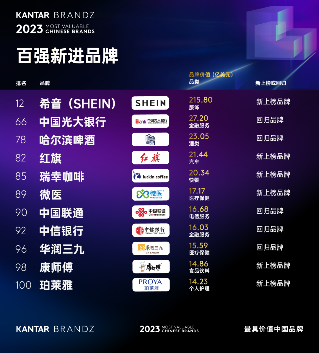 今年,凯度BrandZ中国百强榜单迎来了11新上榜或回归品牌。这些品牌来自九个不同行业,足以证明“英雄莫问出处”。在今天的中国市场中,打造知名品牌仍然有许多途径可供选择。全球时尚品牌希音(SHEIN)(第12名,215.80亿美元)是新跃升榜单中排名最靠前的品牌。