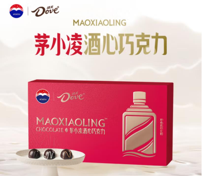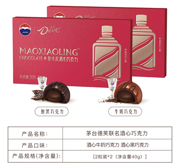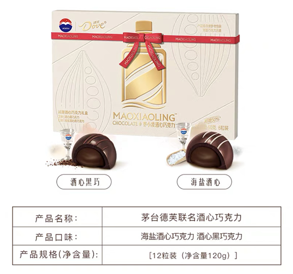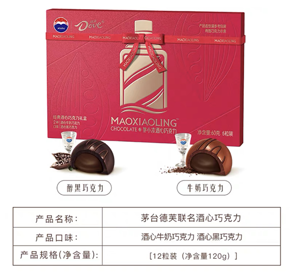 从产品介绍来看,这款“茅台德芙联名酒心巧克力”,每颗都添加了2%的53%vol贵州茅台酒。本次新品有经典和减糖两种口味,2粒装(20g)价格分别为35元、39元,12粒装(120g)价格分别为169元、179元,此外,i茅台APP上级了2粒经典款+2粒减糖款的组合装,售价74元。