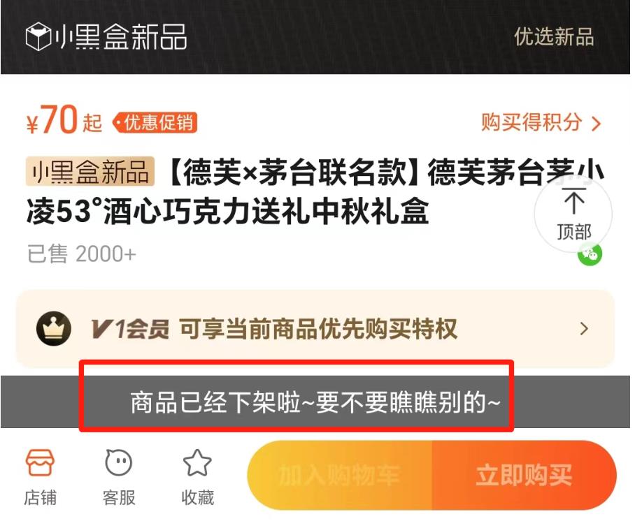 9月16日,茅台与德芙联名款巧克力”茅小凌酒心巧克力”,将于15:30开售。茅台德芙联名巧克力一上架就被一秒而空,不朽情缘网试着抢购一把,结果没有拼到。茅台冰淇淋天猫店、京东茅台自营店、茅台冰淇淋微信小程序、i茅台APP、德芙天猫旗舰店等线上渠道均已售罄。