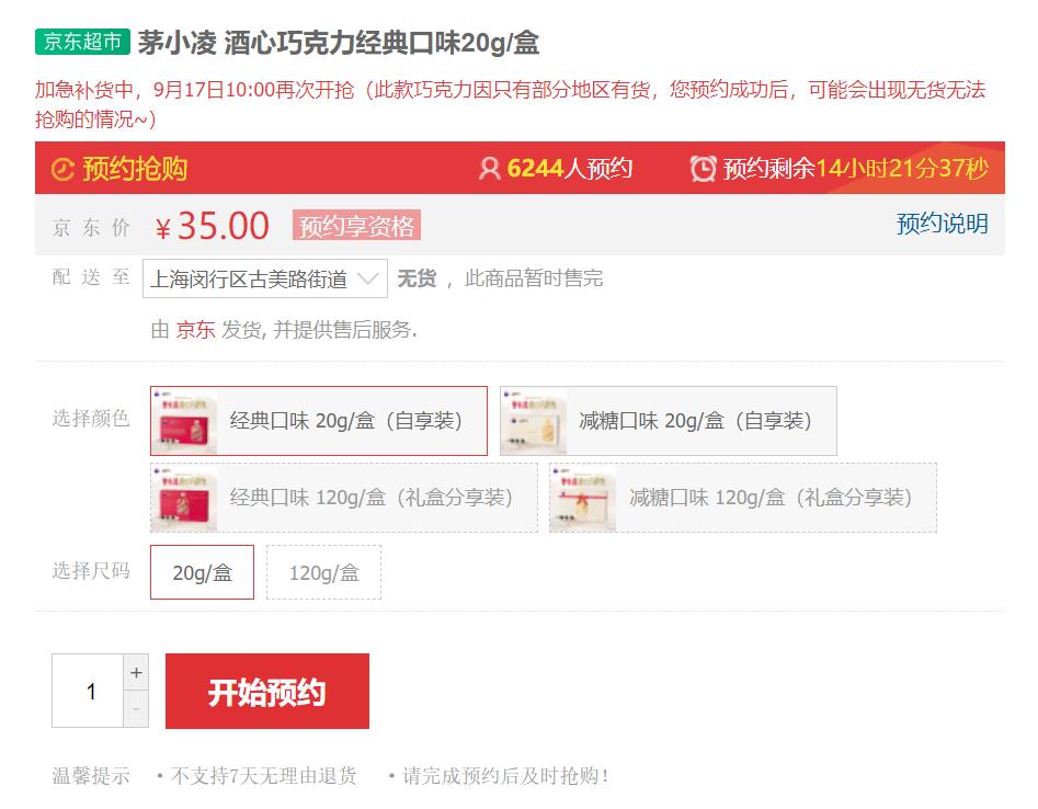 后续怎么买到,据天猫官方了解,已在加紧补货,计划于9月17日至20日每天早上10点和晚上8点发售。贵州茅台京东自营店则采取了预约抢购的方式,用户先预约抢购资格,9月17日10::0开抢,抢购成功完成支付,则购买成功。