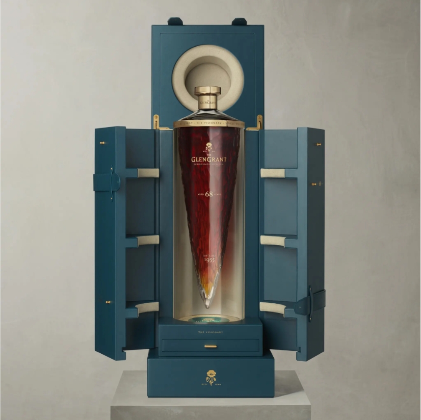 排名第三的是The Glen Grant The Visionary,蒸馏于1955年,熟成于Oloroso雪莉桶(Oloroso Sherry Butt),装瓶于2023年,酒龄为68年,酒精度数为49.2% ABV,容量为1.5升,并且仅装了1瓶,得拍者还将获得一次参观格兰冠酒厂的机会。这瓶酒预估成交价为5至9万英镑,最终成交价为21.25万英镑(含佣金),按现行汇率计算,约合188.45万元人民币。