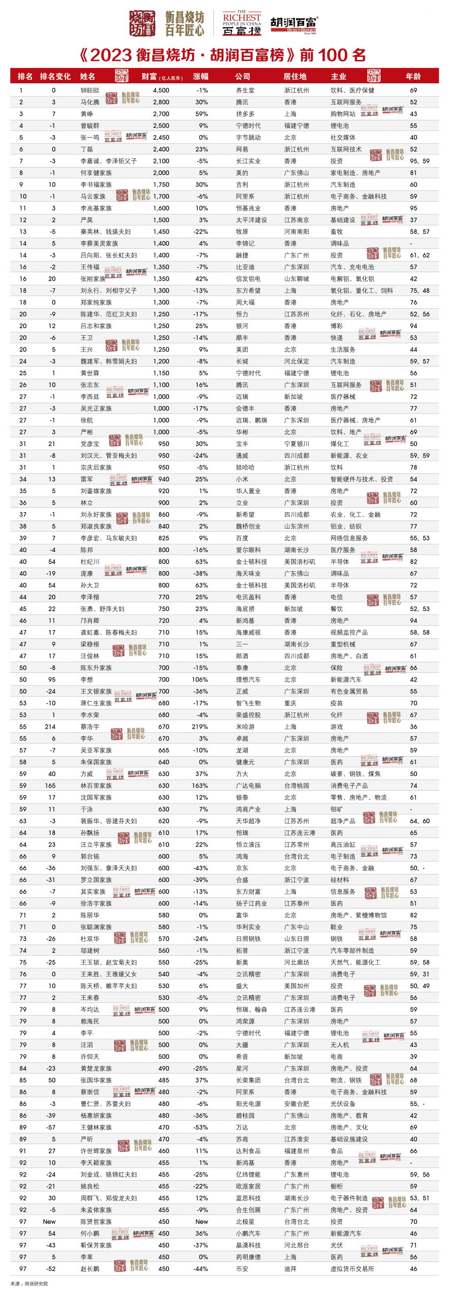 附:《2023衡昌烧坊·胡润百富榜》前100名