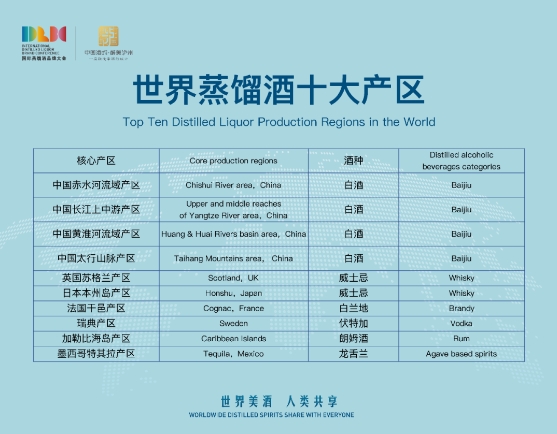 世界蒸馏酒十大产区包括,中国占据4席,包括:中国的赤水河流域产区(白酒)、长江上中游产区(白酒)、黄淮河流域产区(白酒)、太行山脉产区(白酒)、英国苏格兰产区(威士忌)、日本本州岛产区(威士忌)、法国干邑产区(白兰地)、瑞典产区(伏特加)、加勒比海岛产区(朗姆酒)、墨西哥特其拉产区(龙舌兰)。