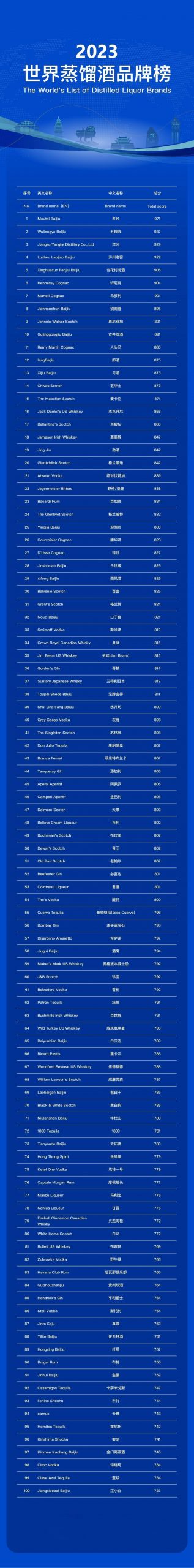 大会评选出100个世界蒸馏酒品牌,其中,中国27家酒企入选,分别为茅台、五粮液、洋河、泸州老窖、杏花村汾酒、剑南春、古井贡酒、郎酒、习酒、劲酒、迎驾贡、今世缘、西凤酒、口子窖、沱牌舍得、水井坊、酒鬼、白云边、老白干、牛栏山、天佑德、贵州珍酒、伊力特酒、红星、金徽、金门高粱酒、江小白入选2023世界蒸馏酒品牌榜。
