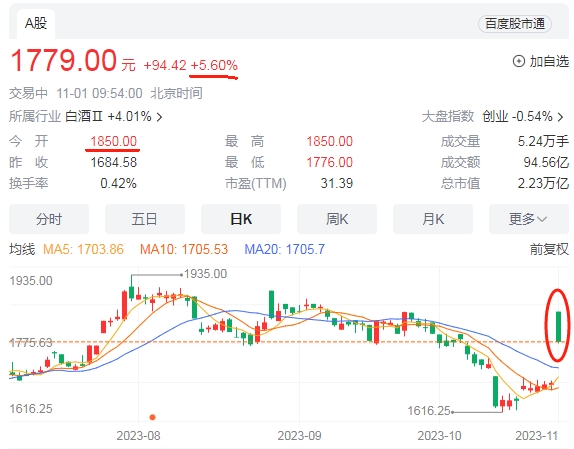 受茅台涨价利好消息影响,11月1日A股开盘,贵州茅台(代码600519)以接近涨停价1850元/股开盘,之后回落至涨幅6%附近。受茅台股价上涨行情带动,整个白酒概念板块高开3%,伊力特、大湖股份、五粮液、泸州老窖等股票跟涨。