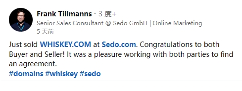 Sedo的Frank Tillmanns在社交平台报告了该域名交易的好消息,他说,Whiskey.com域名杠杠在Sedo.com上被出售,恭喜买家和卖家!看来这是个愉快的交易过程。