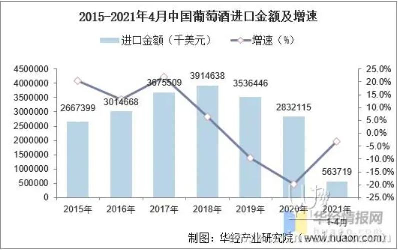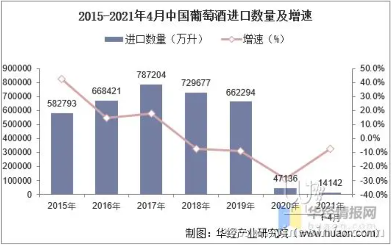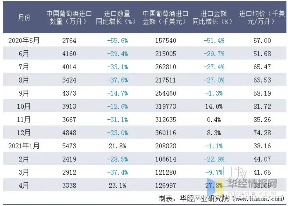 2021年1-4月中国葡萄酒进口数量为14142万升,相比2020年同期减少了1848万升,同比下降7.2%;进口金额为563719千美元,相比2020年同期减少了169398千美元,同比下降3.3%;2021年1-4月中国葡萄酒进口均价为39.86千美元/万升。