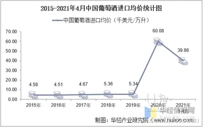 2021年4月中国葡萄酒进口数量为3338万升,同比增长23.1%;进口金额为126997千美元,同比增长27.8%;进口均价为38.05千美元/万升。