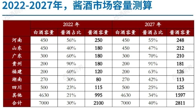 其中,在山东、广东、河南地区,随着价格带的补全、消费氛围的演变,占有率有望从40%、60%、50%更进一步提升至2027年的47%、70%、55%。在湖南地区,市场转酱进入后半场,占有率有望从30%,加速提升至42%。随着核心市场向周边辐射,除具备强势地产酒省份,预计其他市场稳中有升,2027年,非核心市场酱酒市占率有望达到34%。(招商证券)
