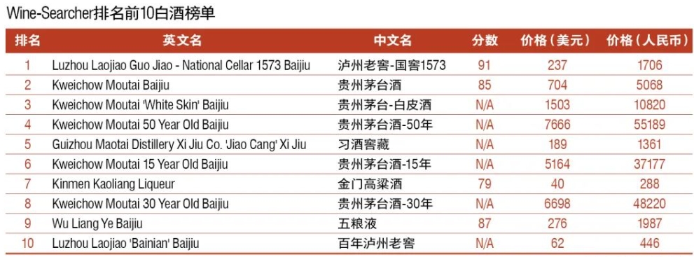 近日,葡萄酒搜索平台 Wine-Searcher根据数据库最新的数据,统计出了一份世界上最受欢迎的前十名白酒榜单。在这份榜单上,国窖1573排名最高,根据 Wine-Searcher 的统计,在目前全世界最受欢迎的酒精饮料排名中,这款白酒位居第65位。,贵州茅台虽然帮上有名,但并非在榜首位置。五粮液虽然在国内非常知名,但却是在今年才登上Top 10榜单。