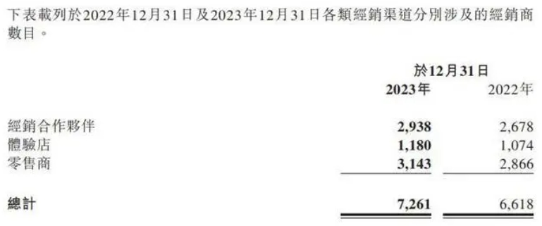 去年,公司经销商数量从上一年的6618家增加值7261家。其中,截至2023年12月31日,经销合作伙伴2938家,体验店1180家,零售商3143家。