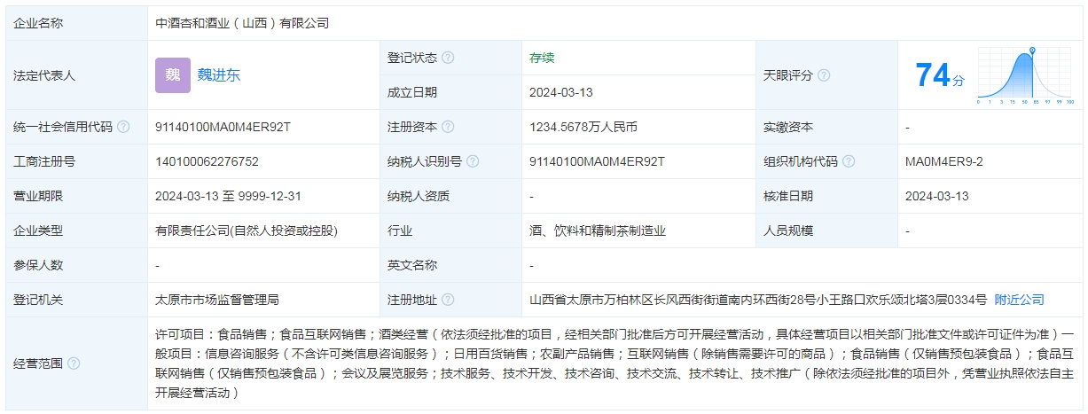 中酒杏和酒业 (山西) 有限公司,成立于2024年,位于山西省太原市,是一家以从事酒、饮料和精制茶制造业为主的企业。企业注册资本1234.5678万人民币,并已于2024年完成了Pre-A轮,交易金额亿级人民币。