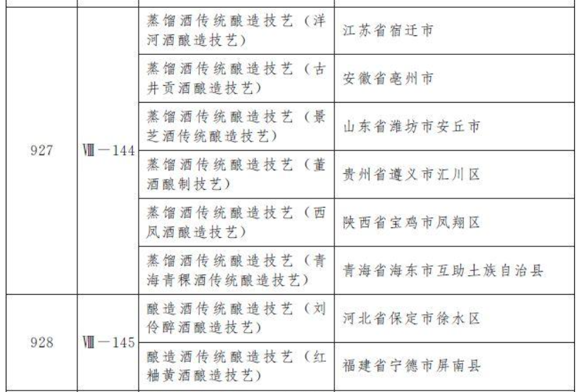 6月10日消息,近日,国务院发布通知称,国务院批准文化和旅游部确定的第五批国家级非物质文化遗产代表性项目名录(共计185项)和国家级非物质文化遗产代表性项目名录扩展项目名录(共计140项),现予公布。其中8种传统的酿酒技艺入选,分别是:洋河酒酿造技艺、古井贡酒酿造技艺、景芝酒传统酿造技艺、董酒酿造技艺、西凤酒酿造技艺、青海青稞酒传统酿造技艺、刘伶醉酒酿造技艺以及红粬黄酒酿造技艺。