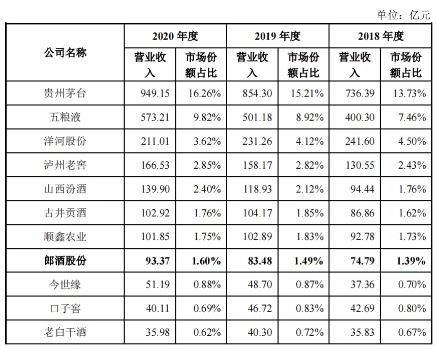 其中郎酒尚未上市,但根据其销量推算,郎酒2020年市场占有率为1.60%,位列白酒上市公司第8位。