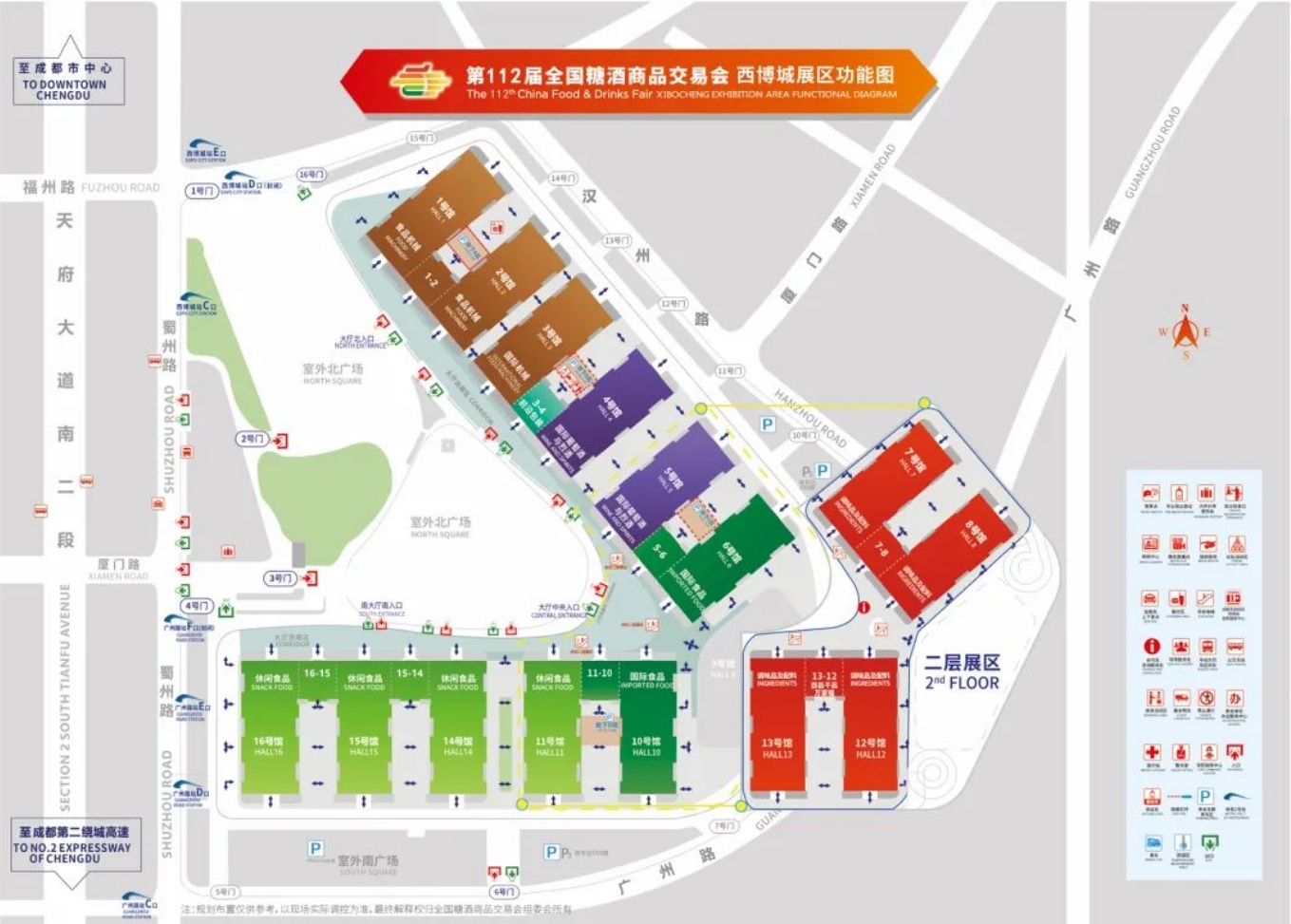 在西博城展场,1-3号馆为食品机械展区、内含国际机械和智能AI设备两个特色专区;3-4连接馆为前沿包装展区;4、5号馆为葡萄酒及国际烈不朽情缘区,内含国家展团、低度潮酒和国际啤酒三个特色专区;11、14、15、16号馆为休闲食品展区,内含糖果及巧克力、健康食品及科技服务、方便速食和坚果及烘焙食品四个特色专区;6号馆和10号馆为国际食品展区,内含一带一路精品专区;7、8、12、13号馆为调味品及配料展区,内含绿色农业、火锅(含餐饮连锁)、百县千品万家福等三个特色专区。预计将有超6500家国内外食品、酒类及相关上下游企业参展。