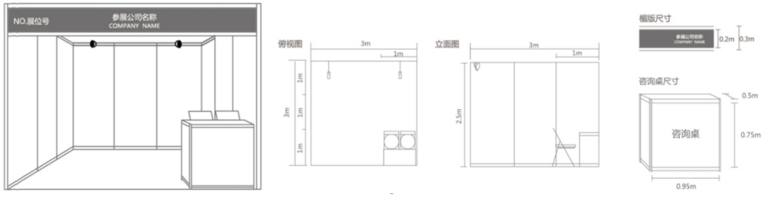 (1)标准展台采用国际标准展架,铝合金构架,三面展墙,中、外文楣板字,两只射灯,一张洽谈桌,两把椅子,一个220V/5A/400W电源插座。