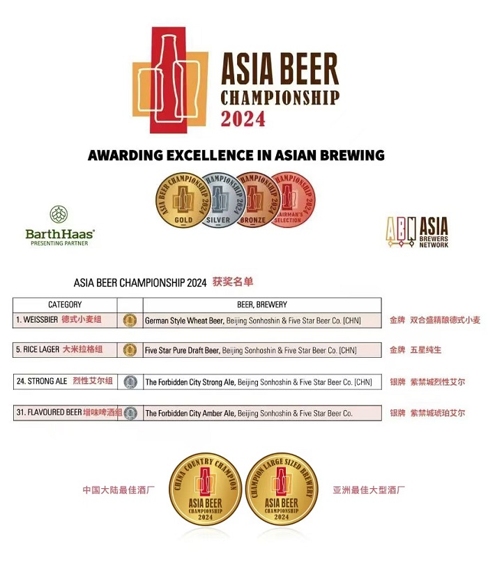 在刚刚结束的2024年亚洲啤酒锦标赛(Asia Beer Championship, 简称ABC)上,中国啤酒生产商北京双合盛五星啤酒有限公司(以下简称双合盛五星公司)一鸣惊人,斩获两金两银,并且在全场决赛中更是获得“亚洲最佳小麦啤酒”“亚洲最佳拉格啤酒”两项大奖,成为本届大赛最大赢家,并毫无争议地获得“中国大陆最佳酒厂”“亚洲最佳大型酒厂”称号。