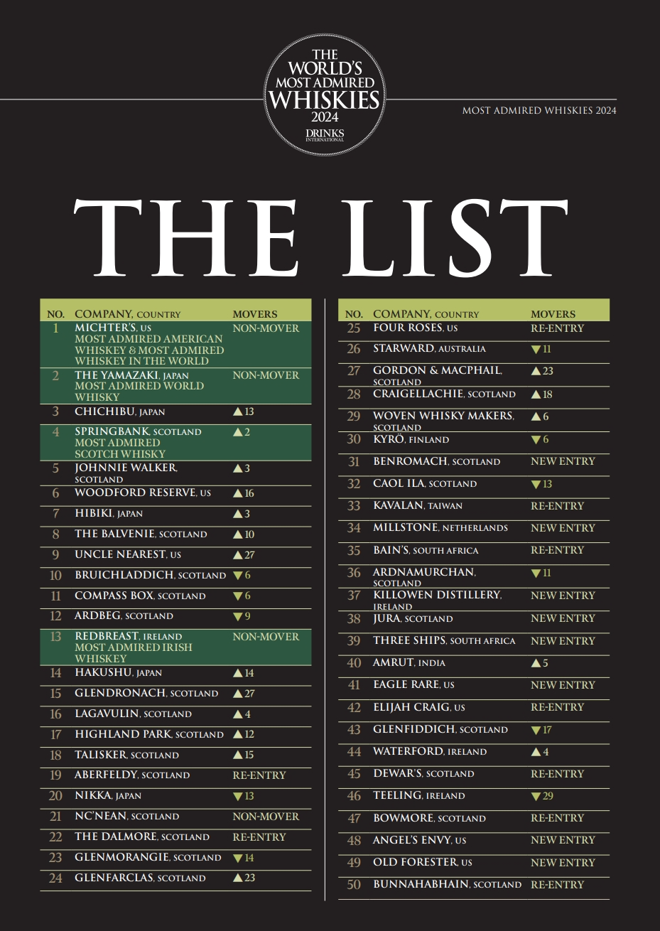 近日,权威媒体Drinks International发布2024年全球最受推崇威士忌品牌TOP 50榜单,每年报告均由全球不同国家和地区的爱好者、记者、调酒师、威士忌专家共同完成,综合结合威士忌的品质、销量、价格等因素,评选出50款最受推崇的威士忌品牌。