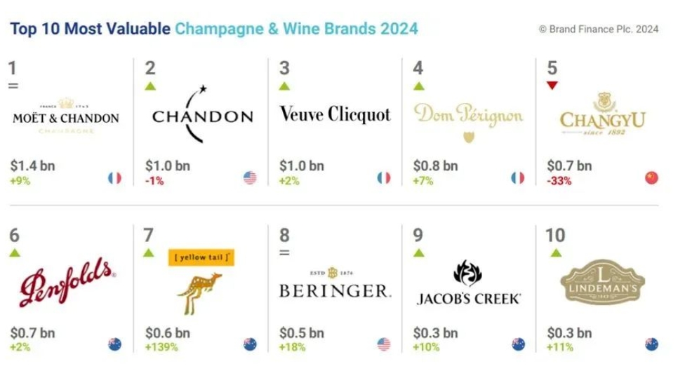 近日,Brand Finance发布“2024全球酒类品牌价值榜”(Alcoholic Drinks 2024)。其中,前十名为:酩悦香槟、香桐、凯歌香槟、唐培里侬香槟、张裕、奔富、黄尾袋鼠、贝灵哲、杰卡斯、利达民。