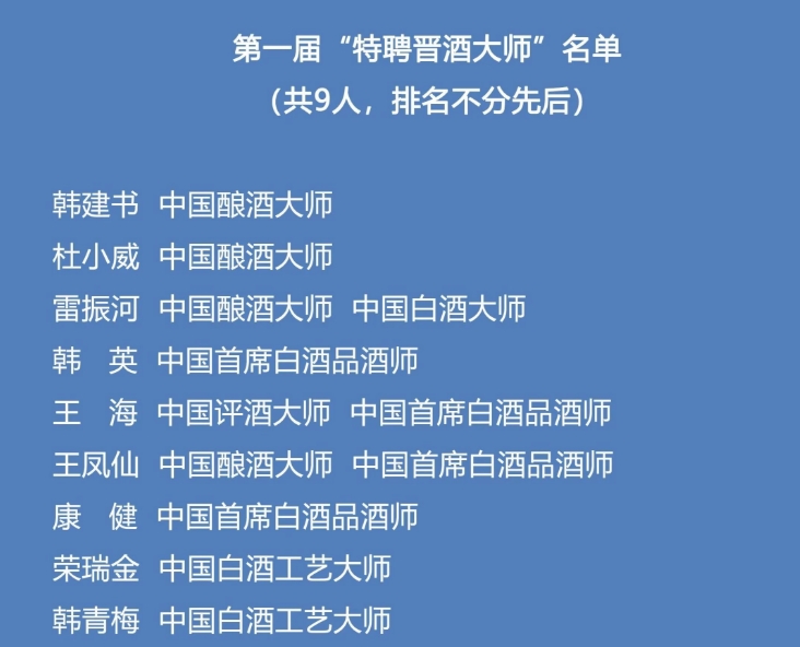 11月25日,山西省食品工业协会发布关于第一届“晋酒大师”评价结果的公示。评选出“晋酒大师”“特聘晋酒大师”各9人,公示期为3个工作日,具体名单如下图。