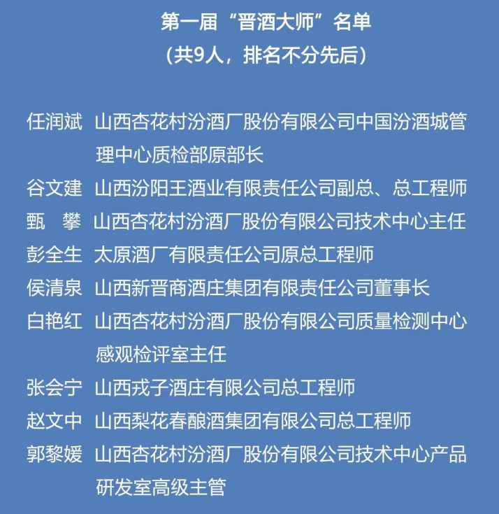 为了推动山西酒业产业健康持续发展,促进酿酒行业人才队伍的建设,完善晋酒行业酿酒师、品酒师和白酒酿造工工种的职业序列,致敬中国大曲清香酒师,弘扬晋酒工匠精神,传承酒师力量,助推我省酒业高质量发展,按照《晋酒大师评价实施办法》,经晋酒大师评价委员会研究,现就第一届“晋酒大师”和“特聘晋酒大师”名单进行公示,公示期为3个工作日,公示期间如有任何异议,请与晋酒大师评价委员会办公室联系,联系电话(0351)7236799。