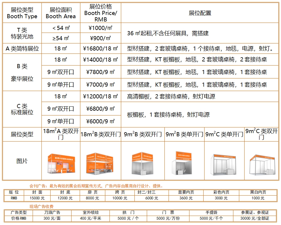 (标准展位3米*3米=9平米,双开口展位另加收1000元人民币)