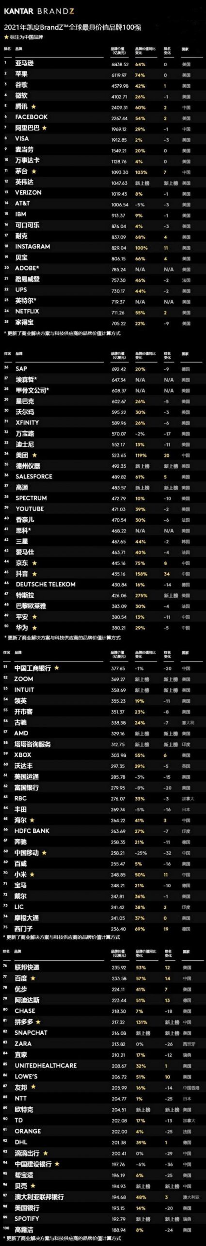 2021年凯度BrandZ最具价值全球品牌排行榜完整榜单