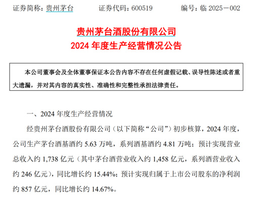 贵州茅台预计实现营业总收入约1738亿元,同比增长约15.44%;其中,茅台酒营业收入约1458亿元,系列酒营业收入约246亿元。贵州茅台预计实现归属于上市公司股东的净利润约857亿元,同比增长约14.67%。贵州茅台称,上述数据为初步核算数据,未经会计师事务所审计。