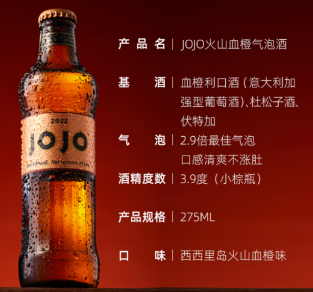 近日,JOJO气泡酒发布消息,旗下新品JOJO火山血橙气泡酒上市售卖。该产品基酒采用血橙利口酒(意大利加强型葡萄酒)、杜松子酒、伏特加,酒精度3.9%vol,容量275ml,具有西西里岛火山血橙味,0嘌呤,0化学添加。